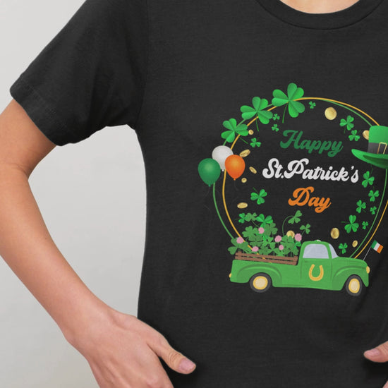 Celebrate St. Patrick’s Day in festive style with this charming vintage truck T-shirt! Featuring a green truck filled with lucky clovers, Irish balloons, gold coins, and a leprechaun hat, this black tee is the perfect mix of cute, retro, and festive. Whether you're attending a parade, party, or just showing off your Irish pride, this St. Patty’s Day shirt is a must-have!